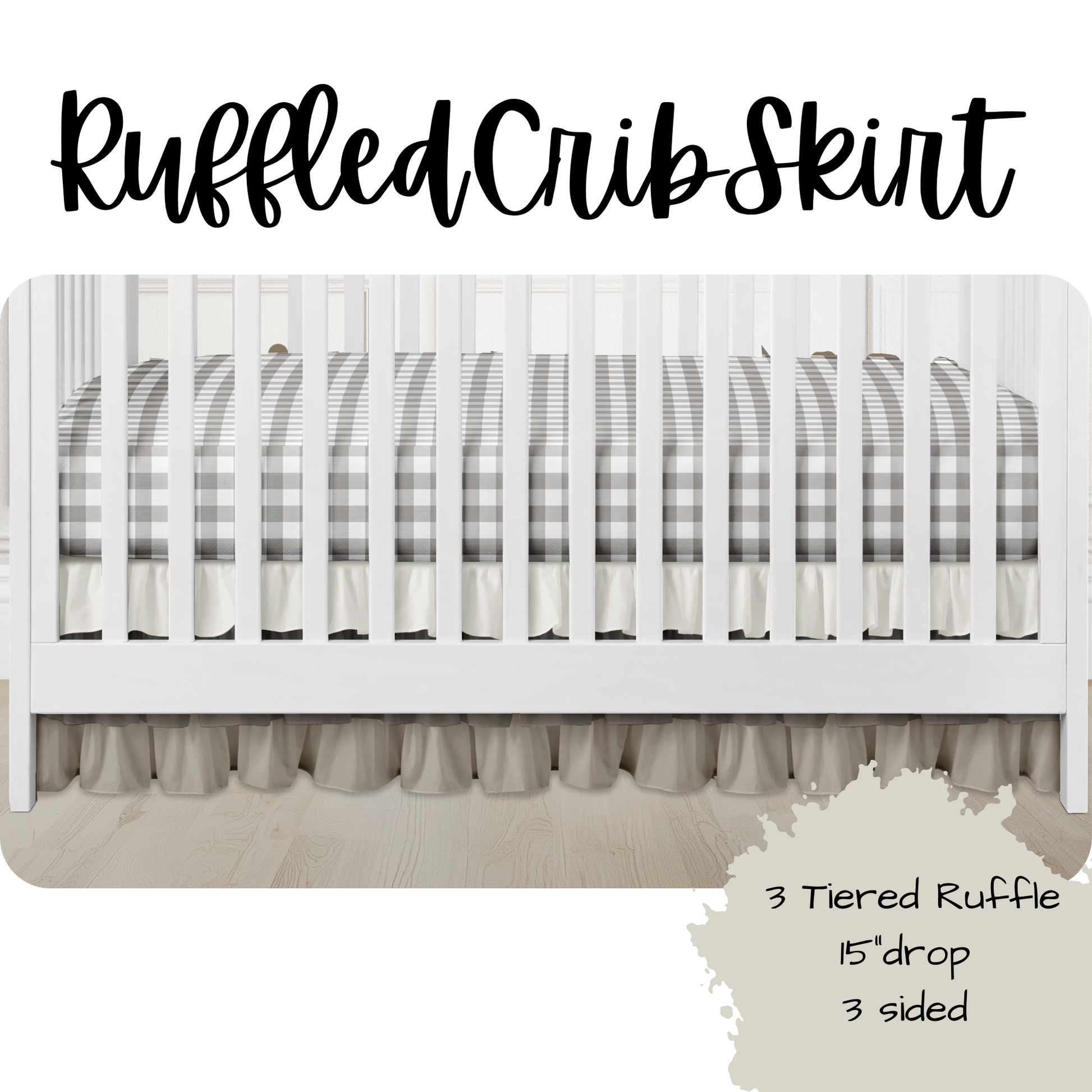 Ruffled: 15" long, 3 sided, fits standard-size north American crib, 100% cotton