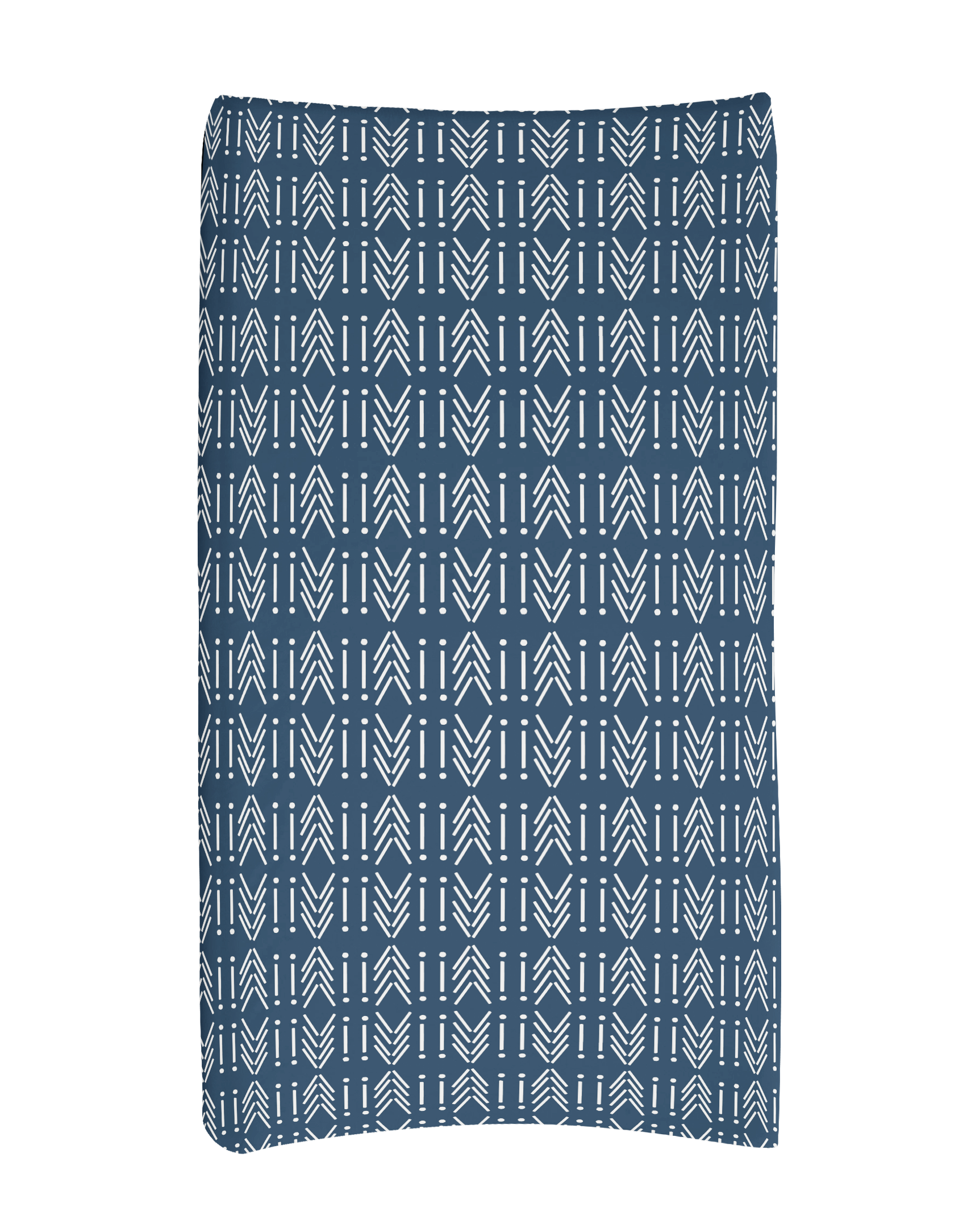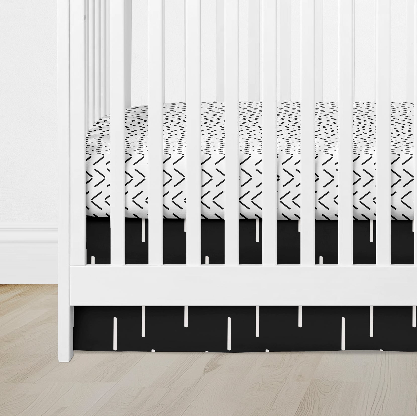 Bold and modern, this mudcloth-inspired crib bedding set brings texture and contrast to any nursery with a black, white, gray, and navy tribal design.