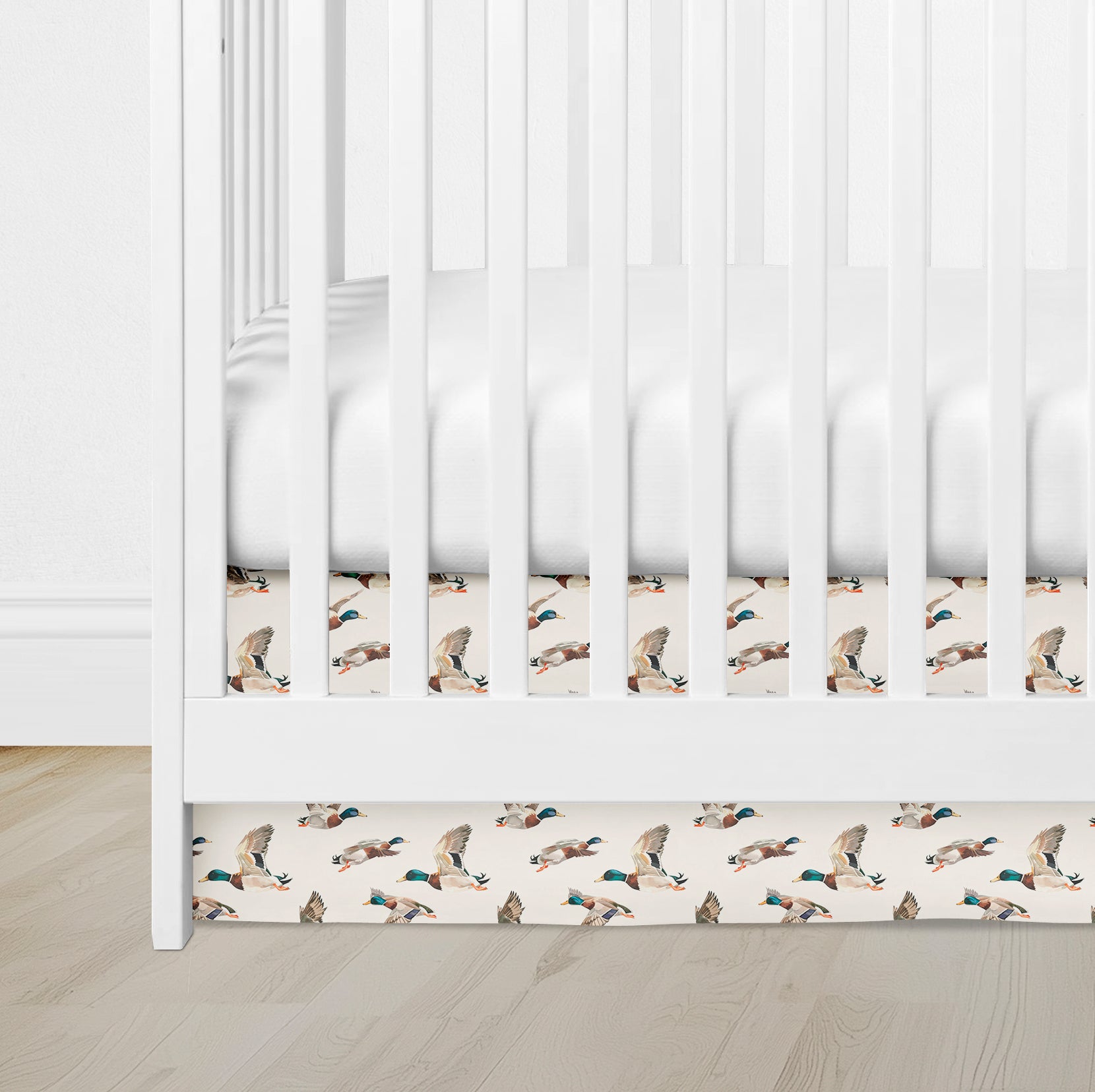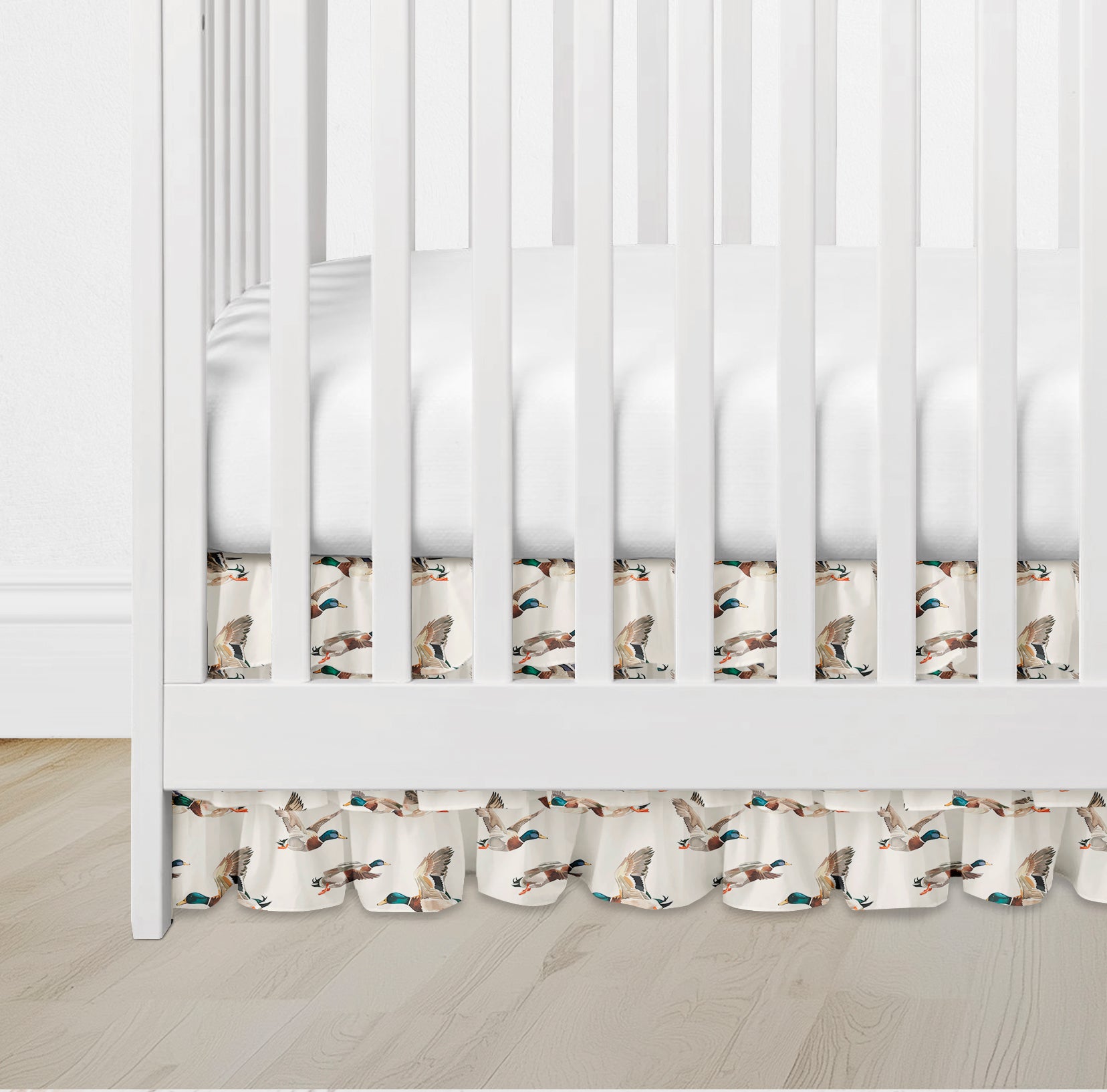 Complete your rustic nursery with our mallard duck crib skirt, available in both flat and ruffle styles. Featuring watercolor flying ducks on a soft cream background, this woodland-inspired design adds a charming finishing touch to your baby’s crib.