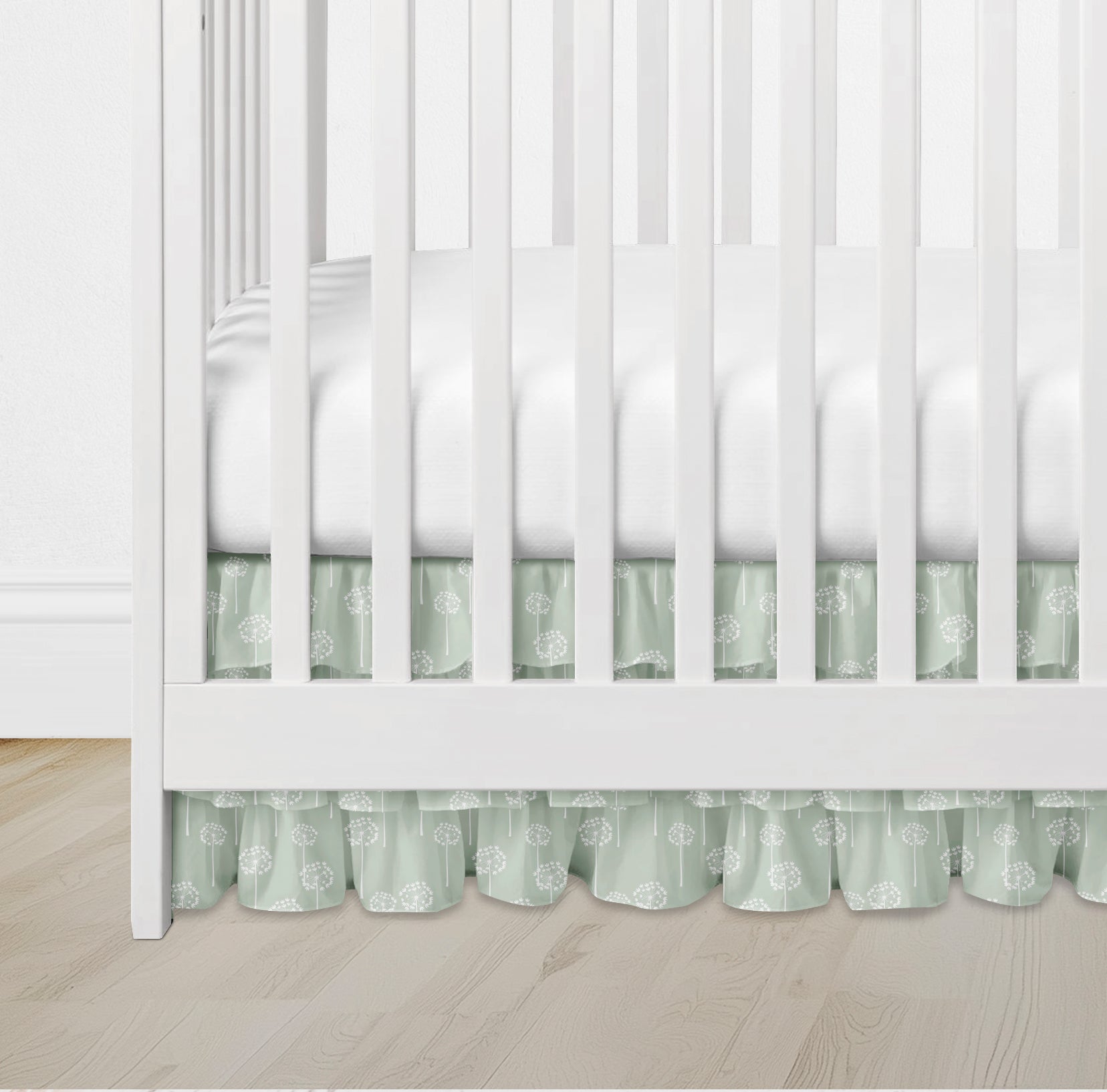 Add a touch of calm, organic charm to the nursery with this soft sage green dandelion crib skirt. Available in flat and ruffle styles, it’s the perfect finishing detail for a modern, nature-inspired nursery.