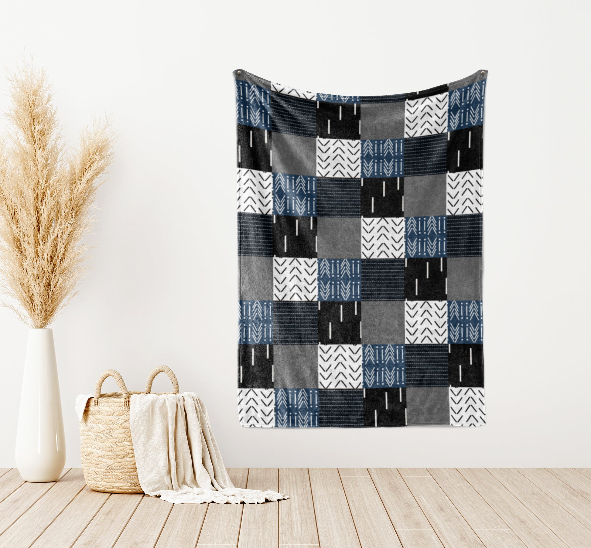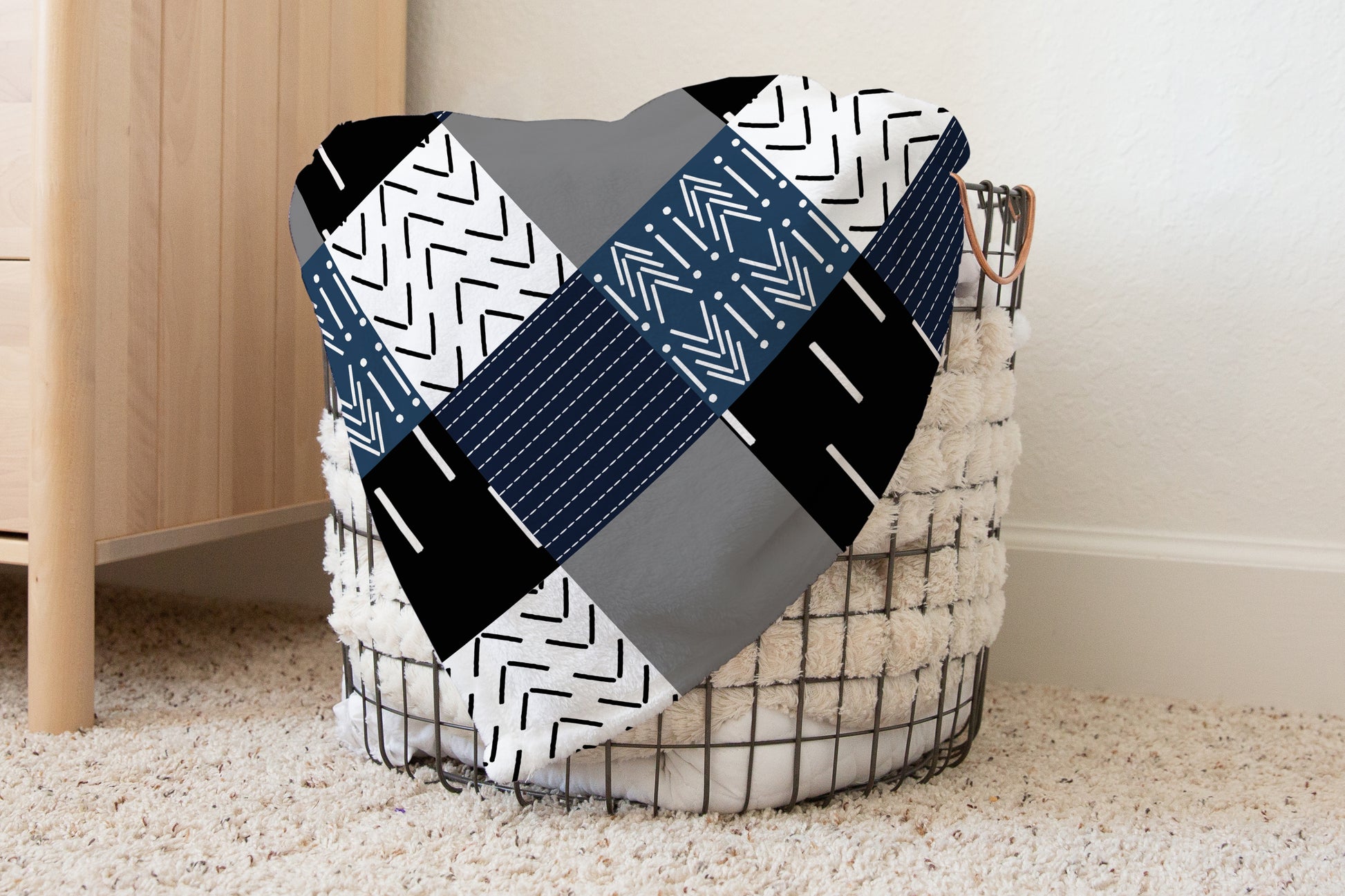 Cozy up your baby’s space with this ultra-soft minky blanket, featuring a patchwork pattern of tribal-inspired prints in navy, black, white, and gray.
