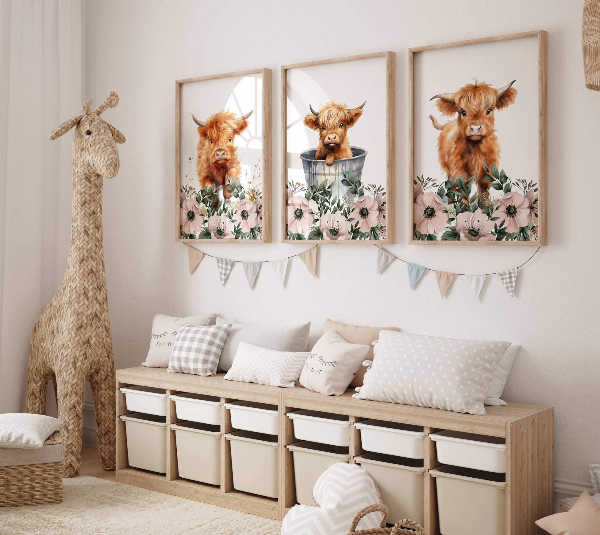 Add rustic charm to your baby girl's room with this set of downloadable Highland cow nursery prints. Featuring sweet cows with blush florals, these digital files are perfect for creating a farmhouse-style nursery in minutes—no shipping required!