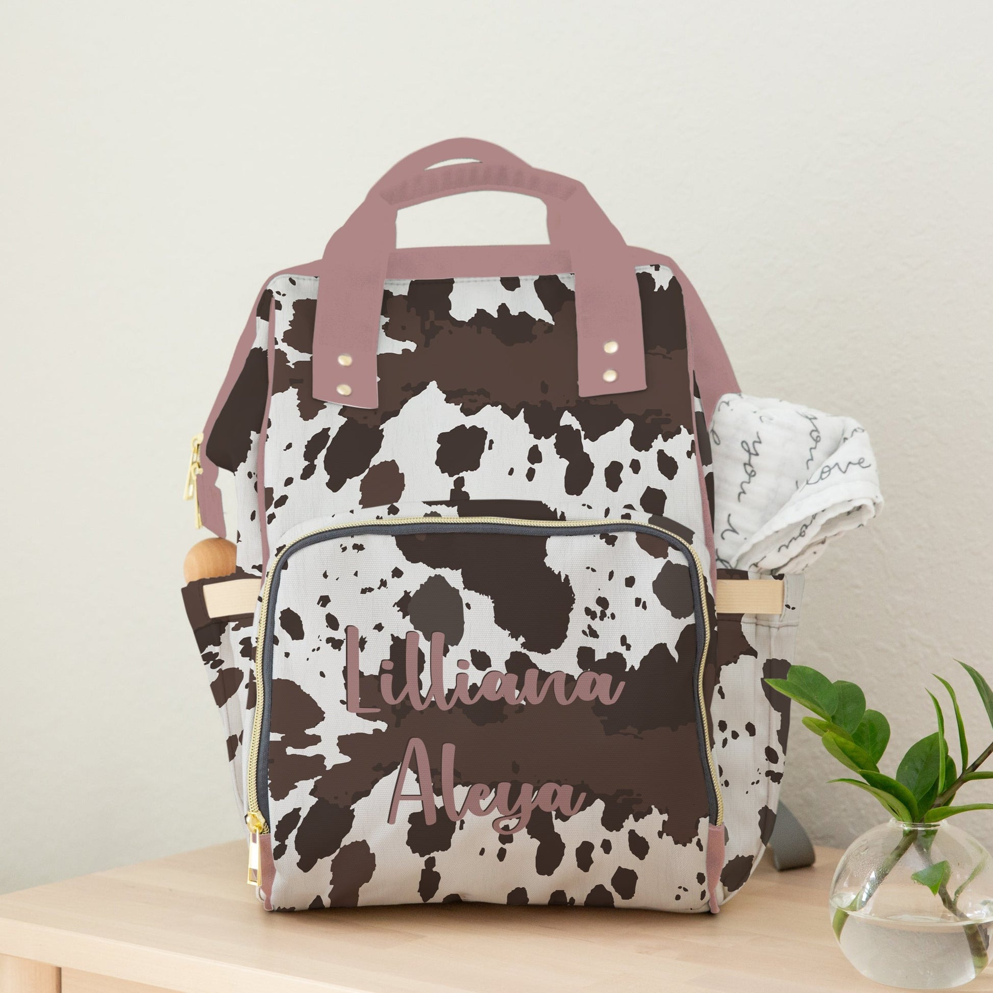 Introducing our Pink and Brown Cowhide Personalized Diaper Bag Backpack! Crafted with love, this functional and stylish backpack is perfect for busy parents on the go.