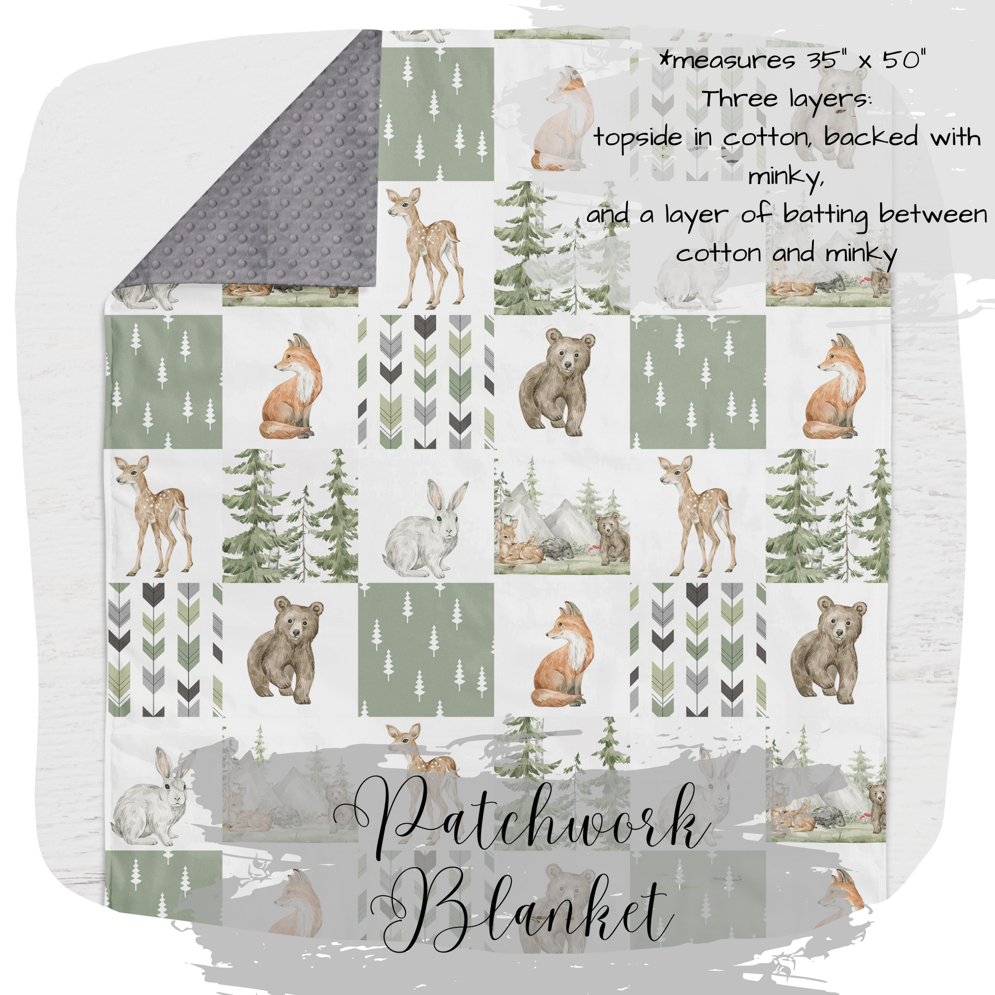 Measures 35โ x 50โ, 100% organic cotton sateen on the patterned topside, backed in hypoallergenic minky, includes a layer of bamboo batting between cotton and minky.